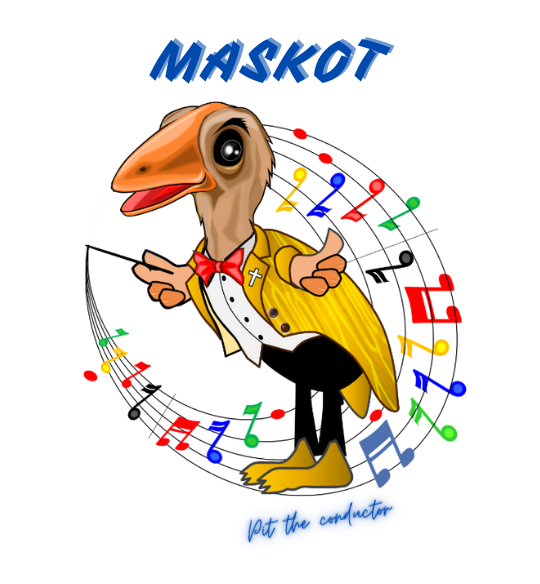 Maskot Pesparawi Nasional XIV 2025, Manokwari Papua Barat, adalah, seorang anak burung Kasuari bernama Pit, bergaya konduktor, dengan notasi di sekelilingnya.